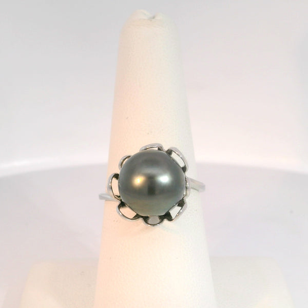 Lady's White Ss Ring Size 7 With One Tahitian Black Pearl