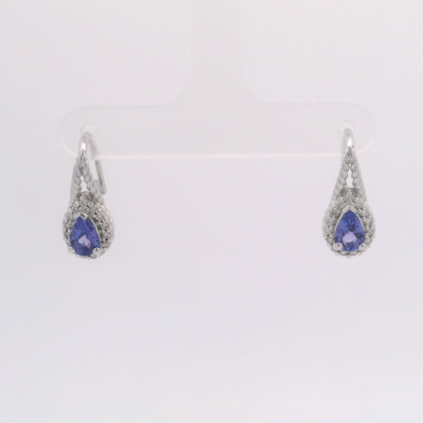 TANZANITE EARRINGS with WG/SILVERTONED 14KW D=.18TW TANZ=.80CTTWPEAR SHAPE W/ DIAM HALO
