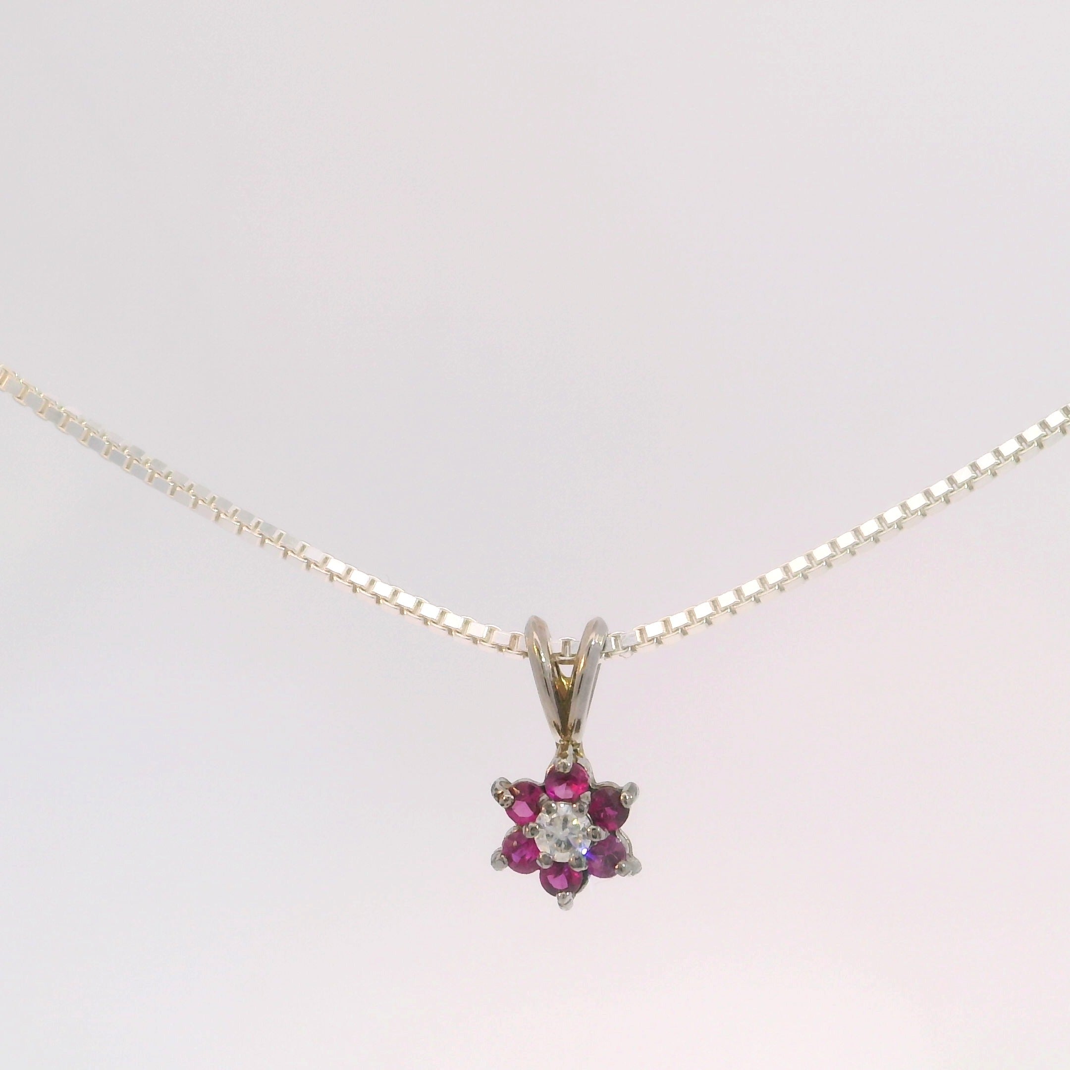 Lady's White 14 Karat Pendants FLOWER CLUTER HALO PENDANT RUBY AND DIAMOND