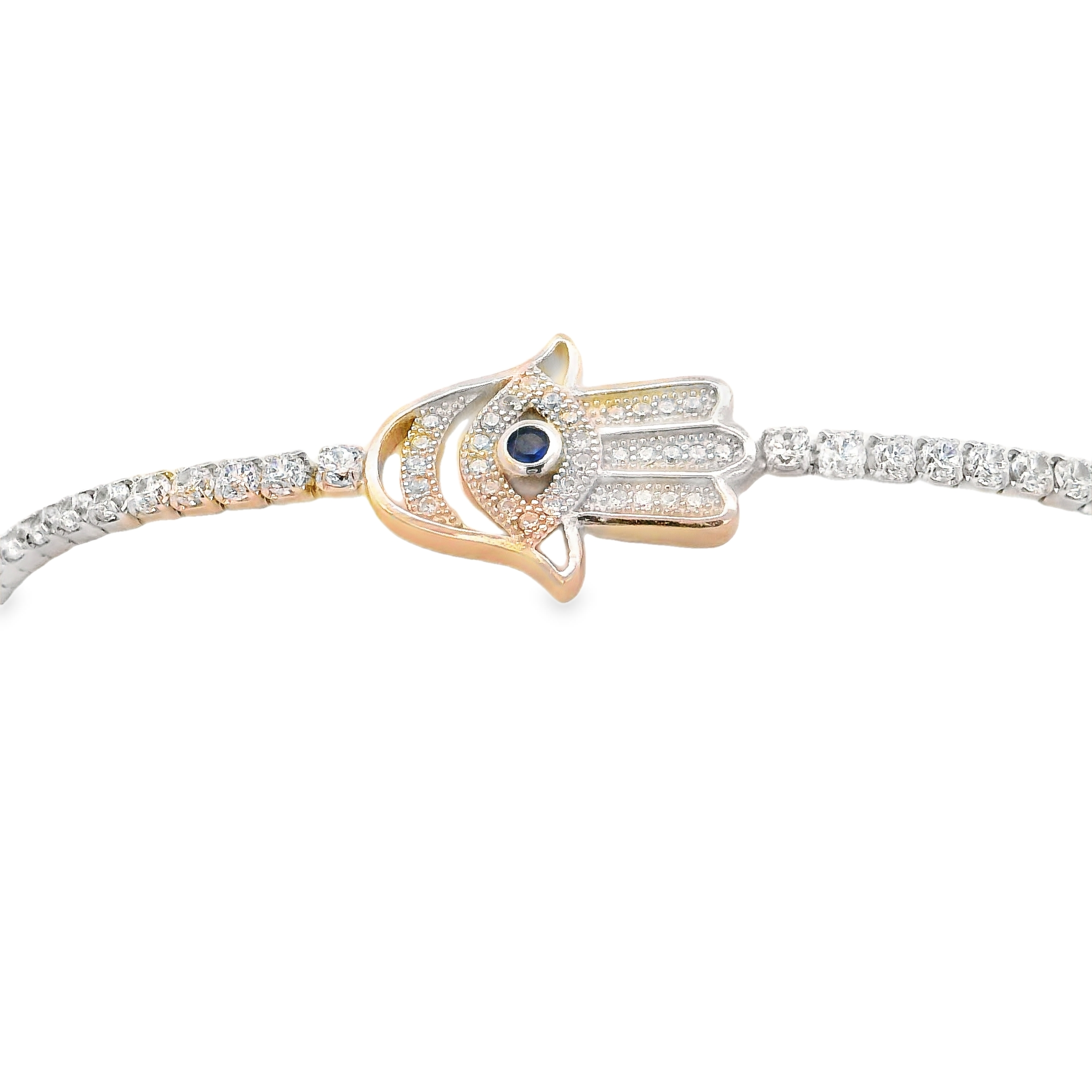 Sterling Silver Rhodium Plated Hamsa bracelet with clear and blue czs