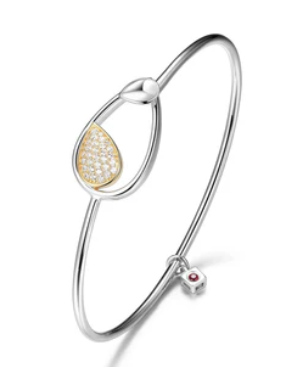 Sterling Silver Bangle with Pear Shape (21X15mm) and Pave CZ, Circumference 6.75", 2 Tone, Rhodium and 18K Yellow Gold Plated